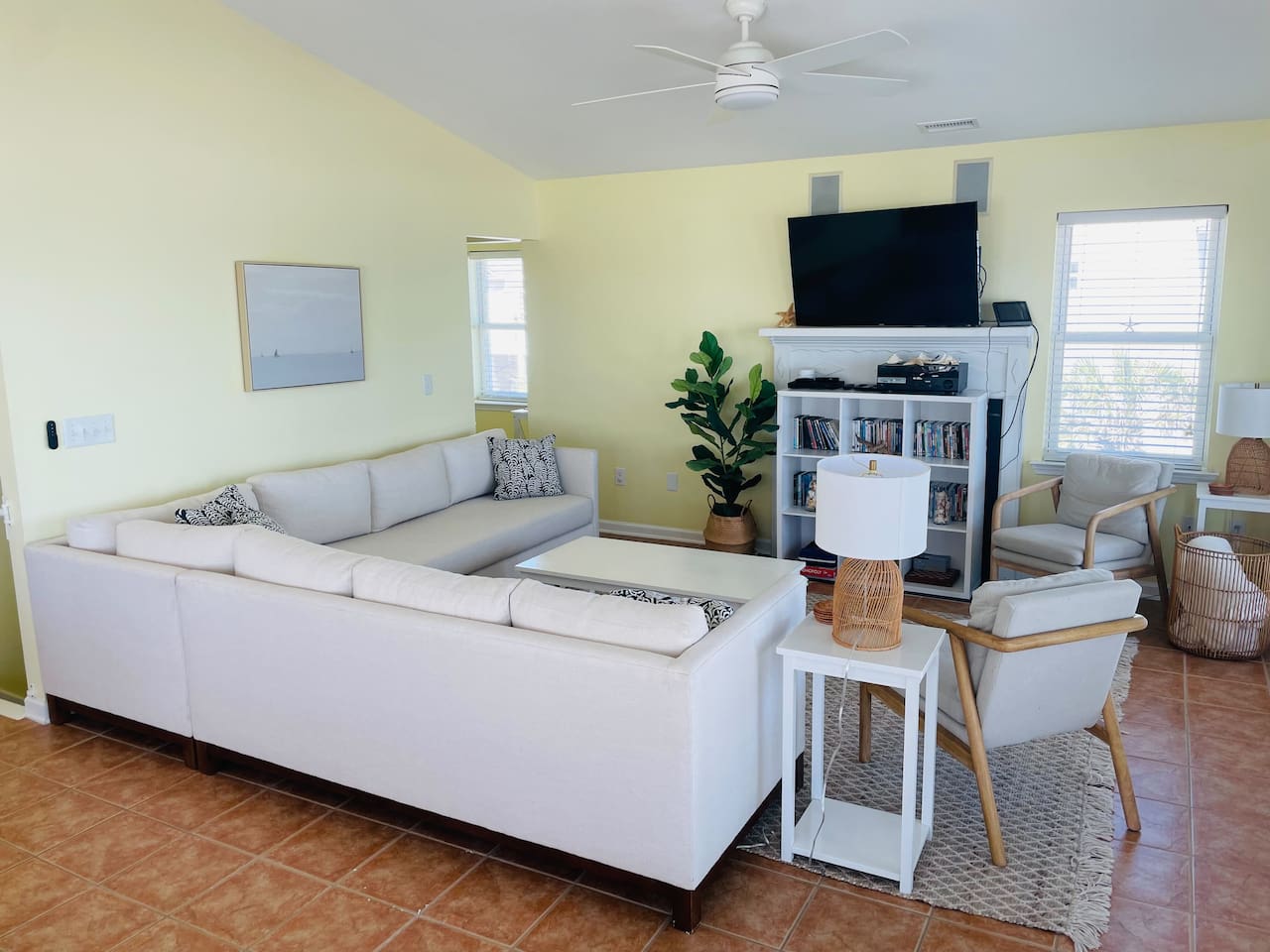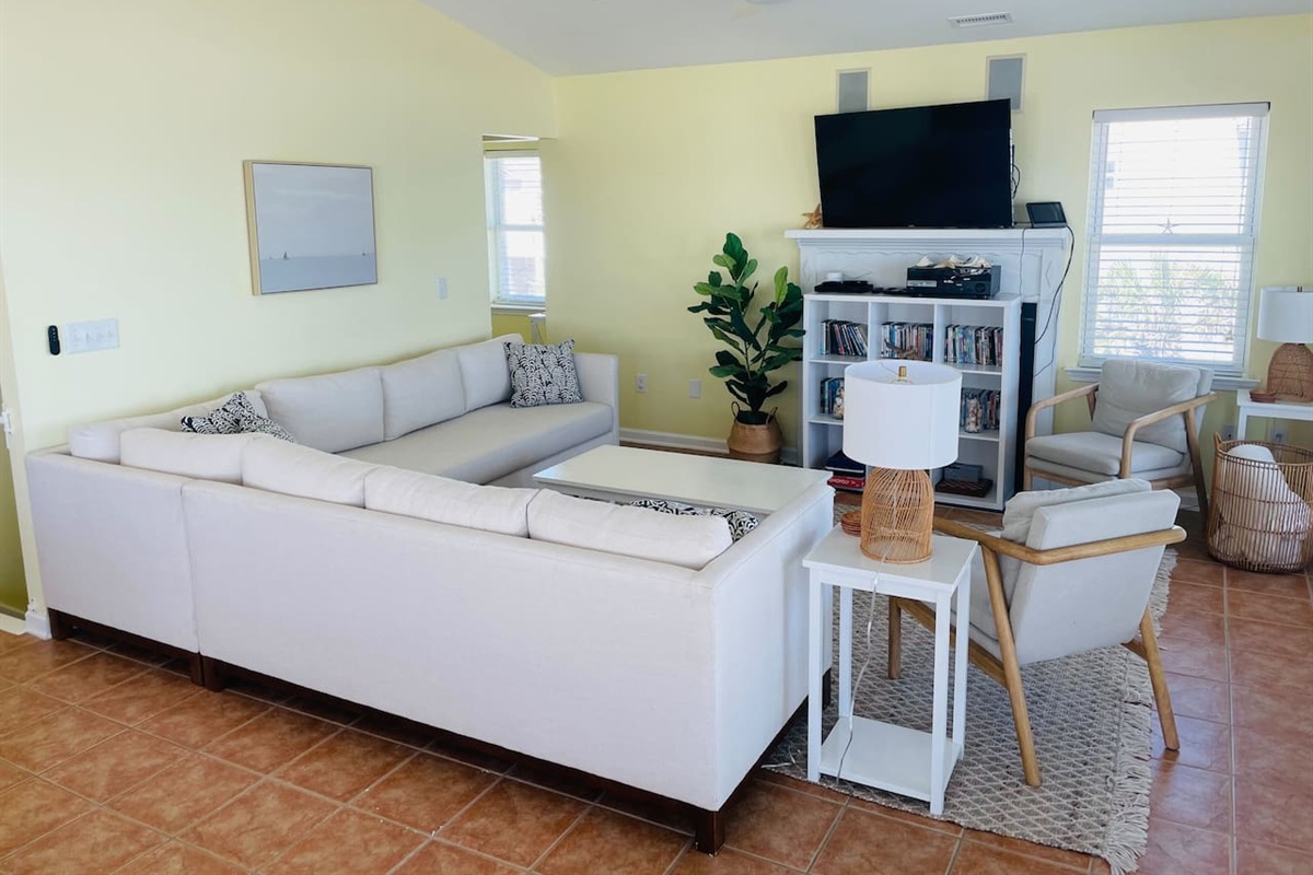Living space with ocean views and large TV. Notice in-ceiling speakers for surround sound. Connect to stereo system with your phone via bluetooth.