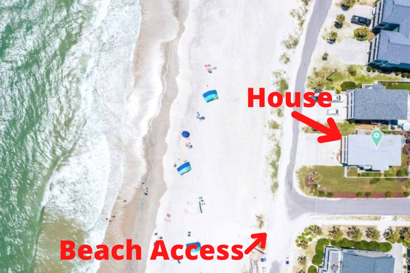 Arieal view of house facing the beach. Our house is the corner lot in the center of this photo. Beach access literally steps from our house!